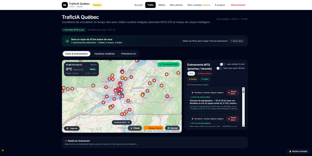 TraficIA Québec est une application web conçue pour t’aider à planifier tes déplacements intelligemment. Elle analyse le trafic en temps réel, affiche les caméras routières du MTQ, et surveille automatiquement tes trajets enregistrés.